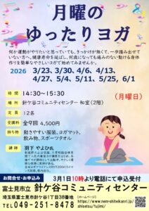 月曜のゆったりヨガ教室 日時 3/23 3/30 4/6 4/13 4/27 5/4 5/11 5/25 6/1 月曜日 14時30分~15時30分 場所 針ヶ谷コミュニティセンター 和室 定員 12名 受講料 4500円 持ち物 動きやすい服装 ヨガマット 飲み物 スポーツタオル 講師 羽下やよひ 先生 申込み 3月1日 10時より 電話にて 受付 針ヶ谷コミュニティセンター 049-251-8478
