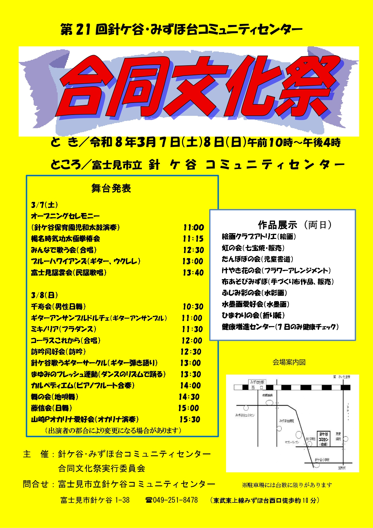 富士見市立針ケ谷コミュニティセンターにて、第21回、針ケ谷・みずほ台コミセン合同文化祭を開催いたします。
