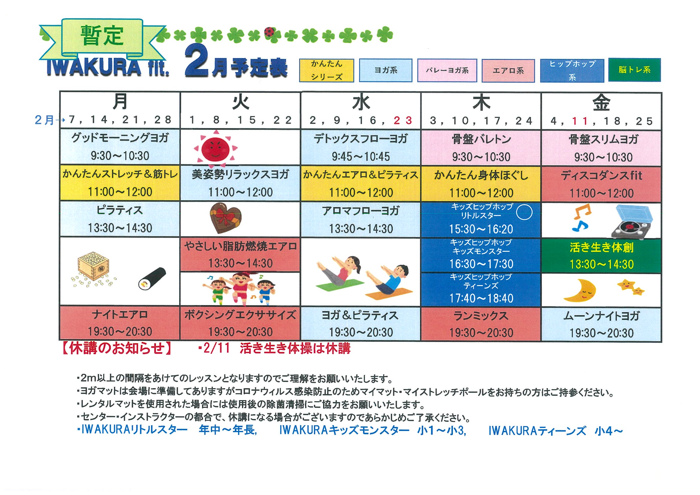 2月IWAKURAFitスケジュールとなります。皆様の、ご参加お待ちしております。