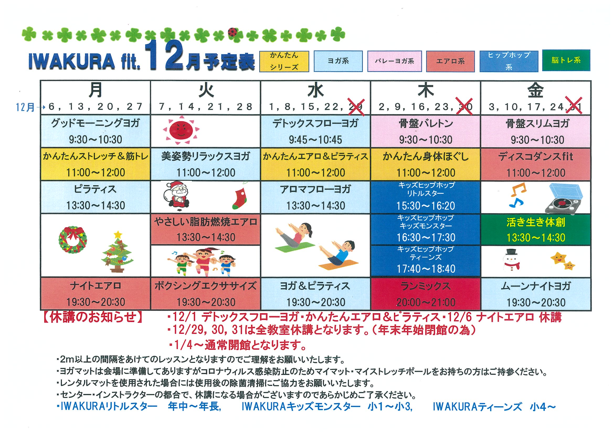 12月IWAKURAFitスケジュールとなります。 ・12/1デトックスフローヨガ 休講