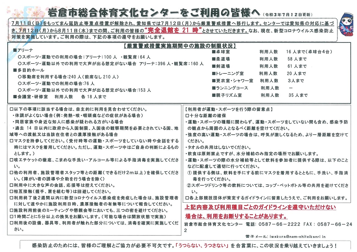 愛知県厳重警戒措置における岩倉市総合体育文化センターの対応につきまして、次のようにセンターの制限をさせていただきます。開館時間 09:00