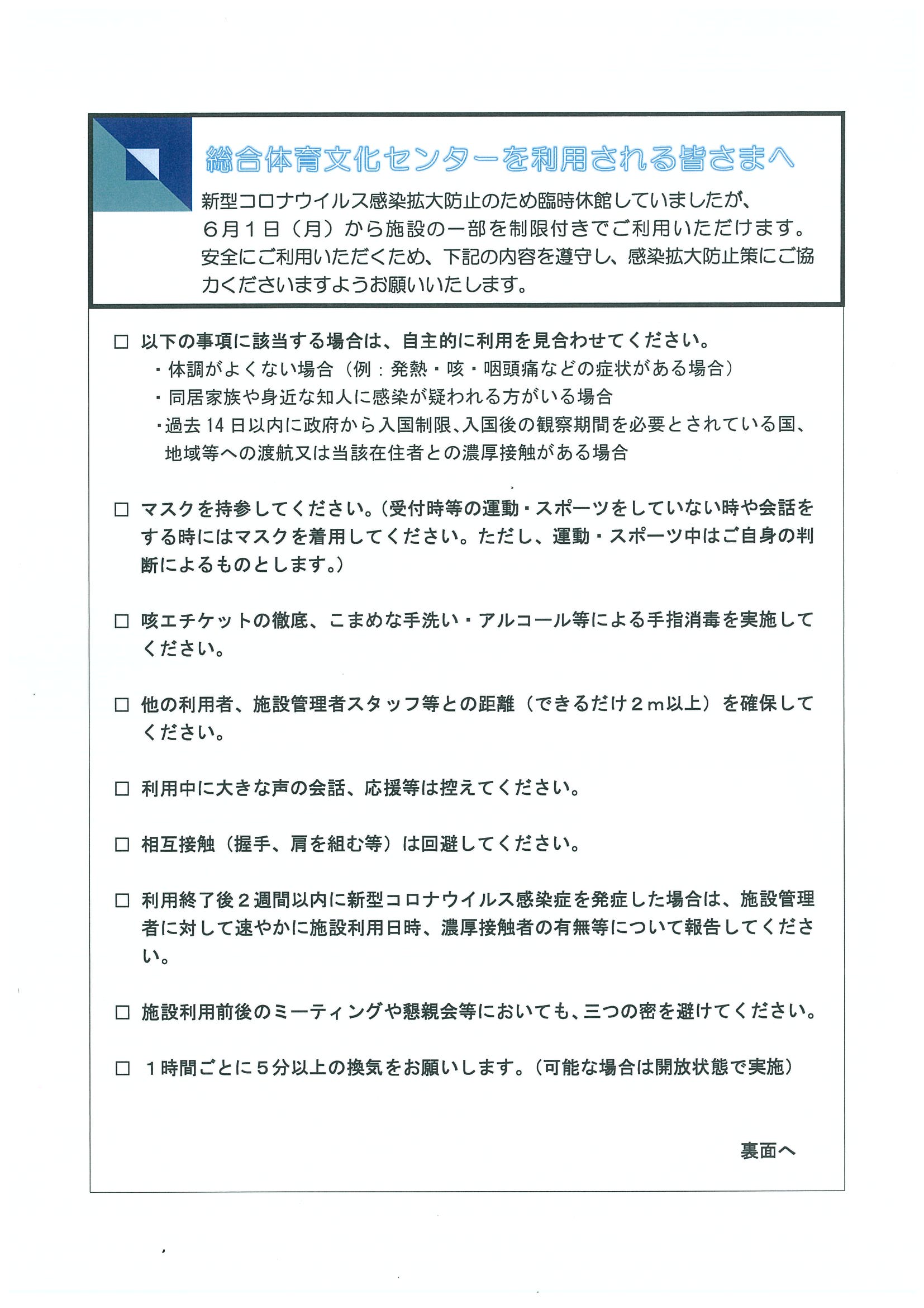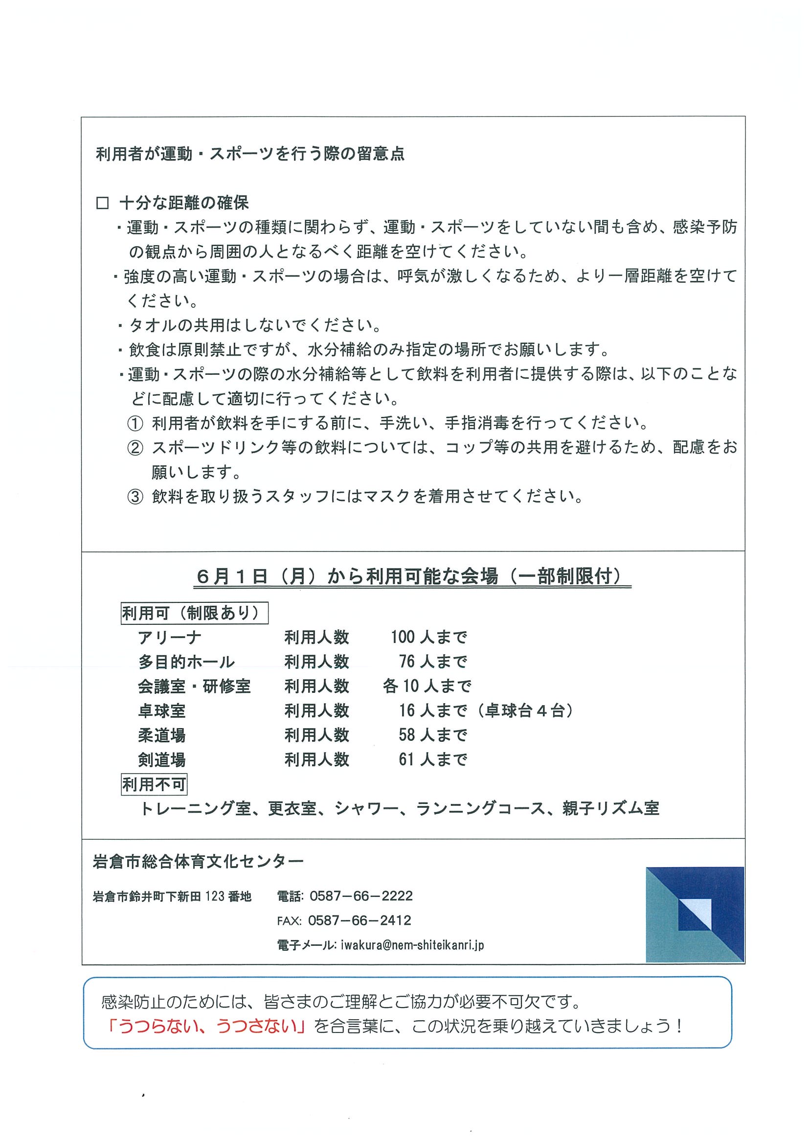 重要!! 6月1日(月)から岩倉市総合体育文化センター 再開されます。