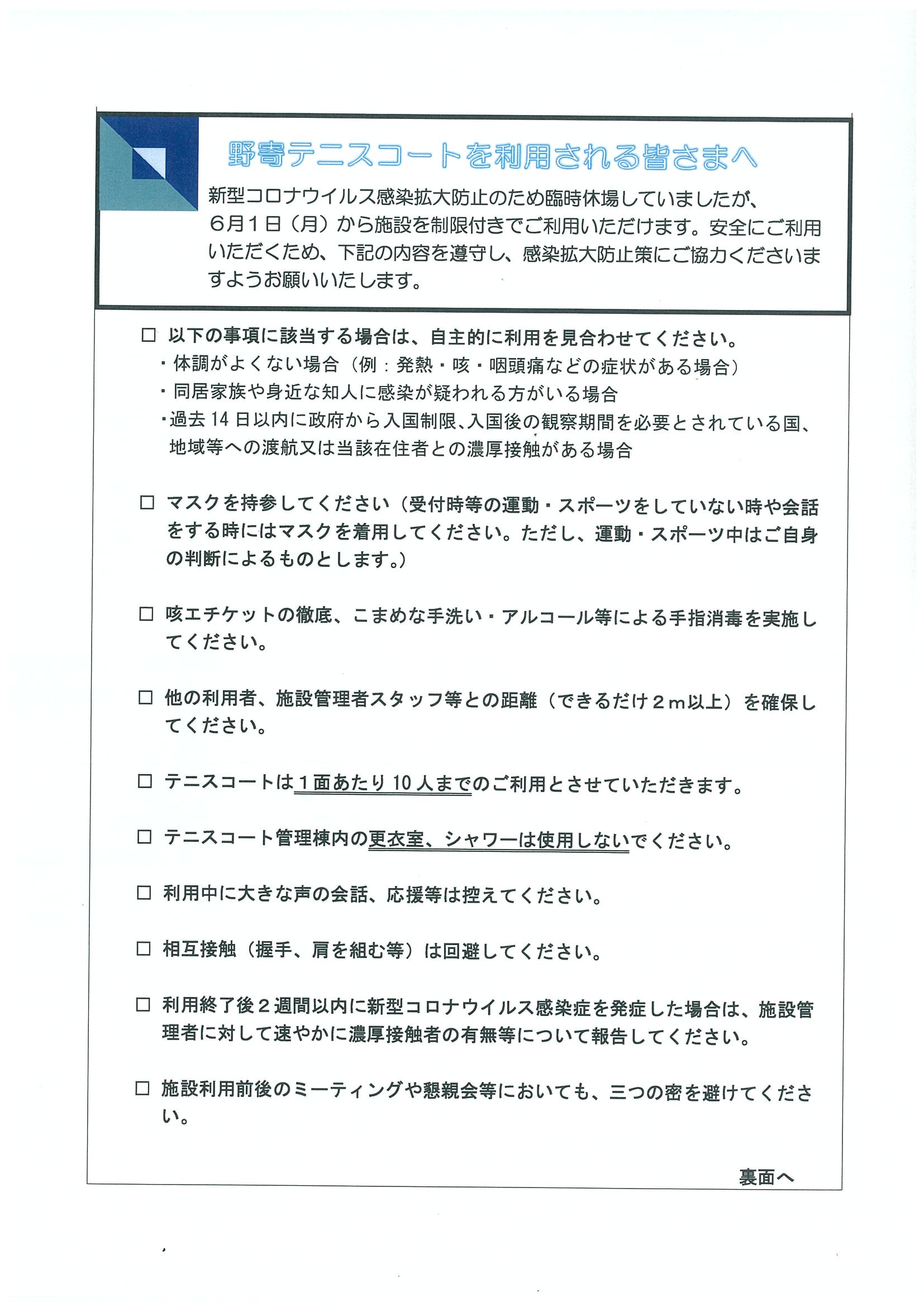 野寄テニスコートご利用のみなさまへ。