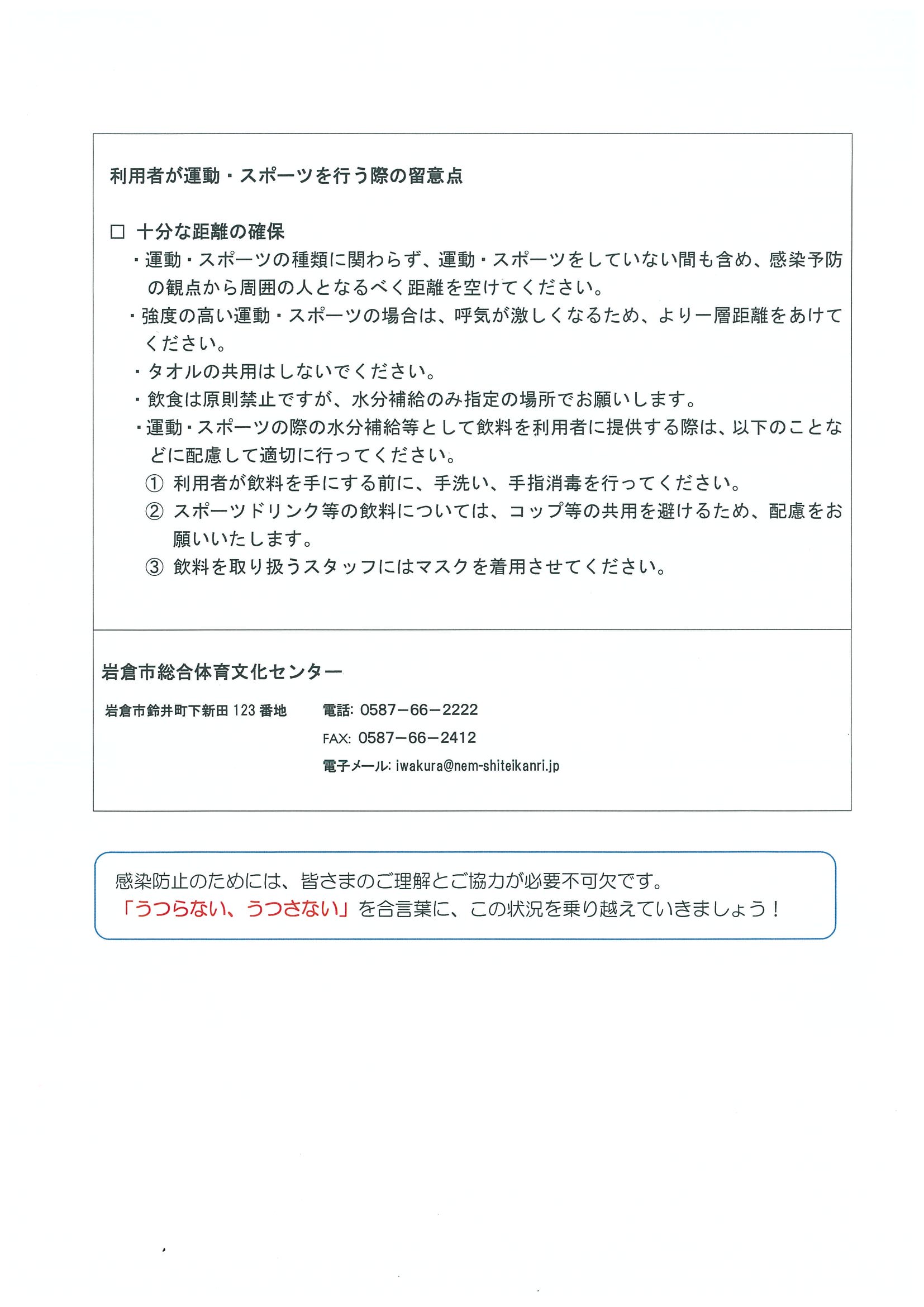岩倉市総合体育文化センターをご利用されるみなさまへ。