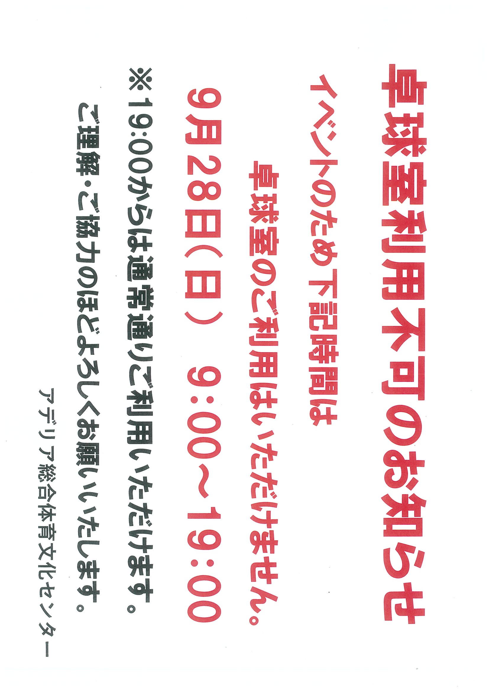 9月28日(日) イベントのため卓球室は9:00〜19:00ご利用いただけません。なお、19:00からは通常通りご利用いただけます。
