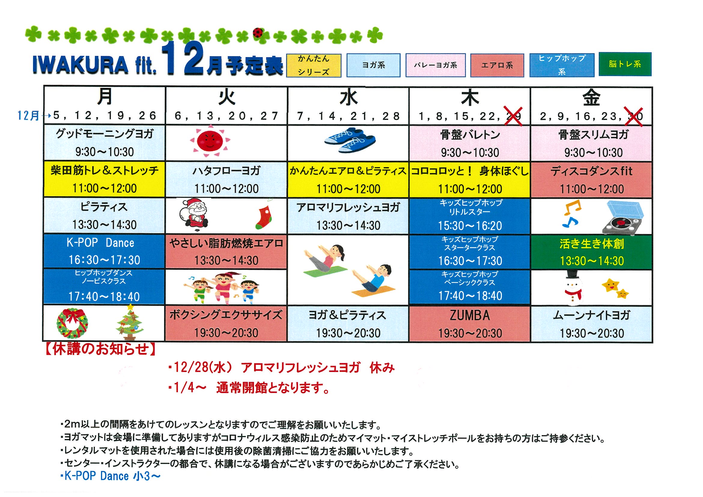 12月 IWAKURAfit スケジュールとなります。皆様の、ご参加お待ちしております。