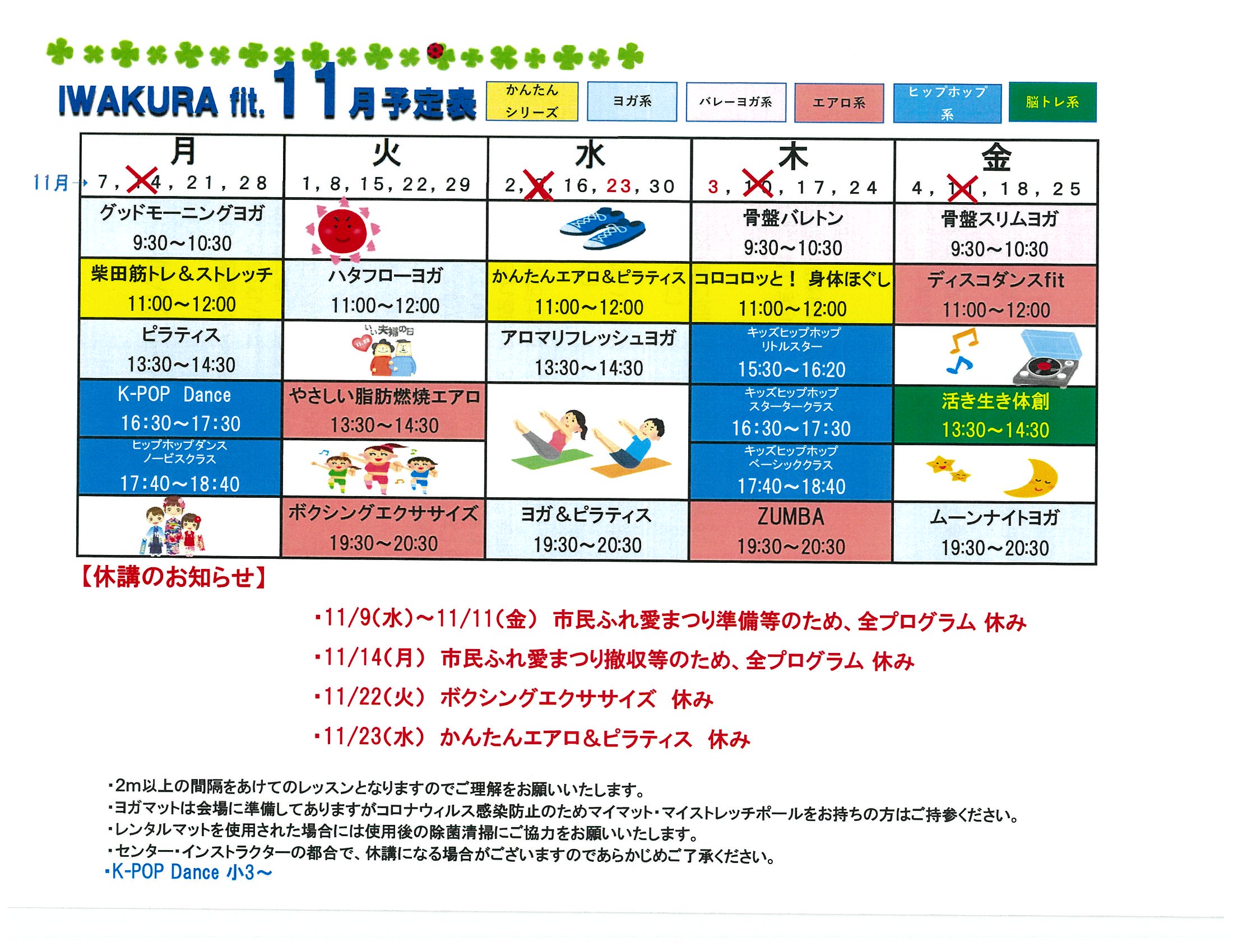 11月 IWAKURAFitスケジュールとなります。皆様の、ご参加お待ちしております。