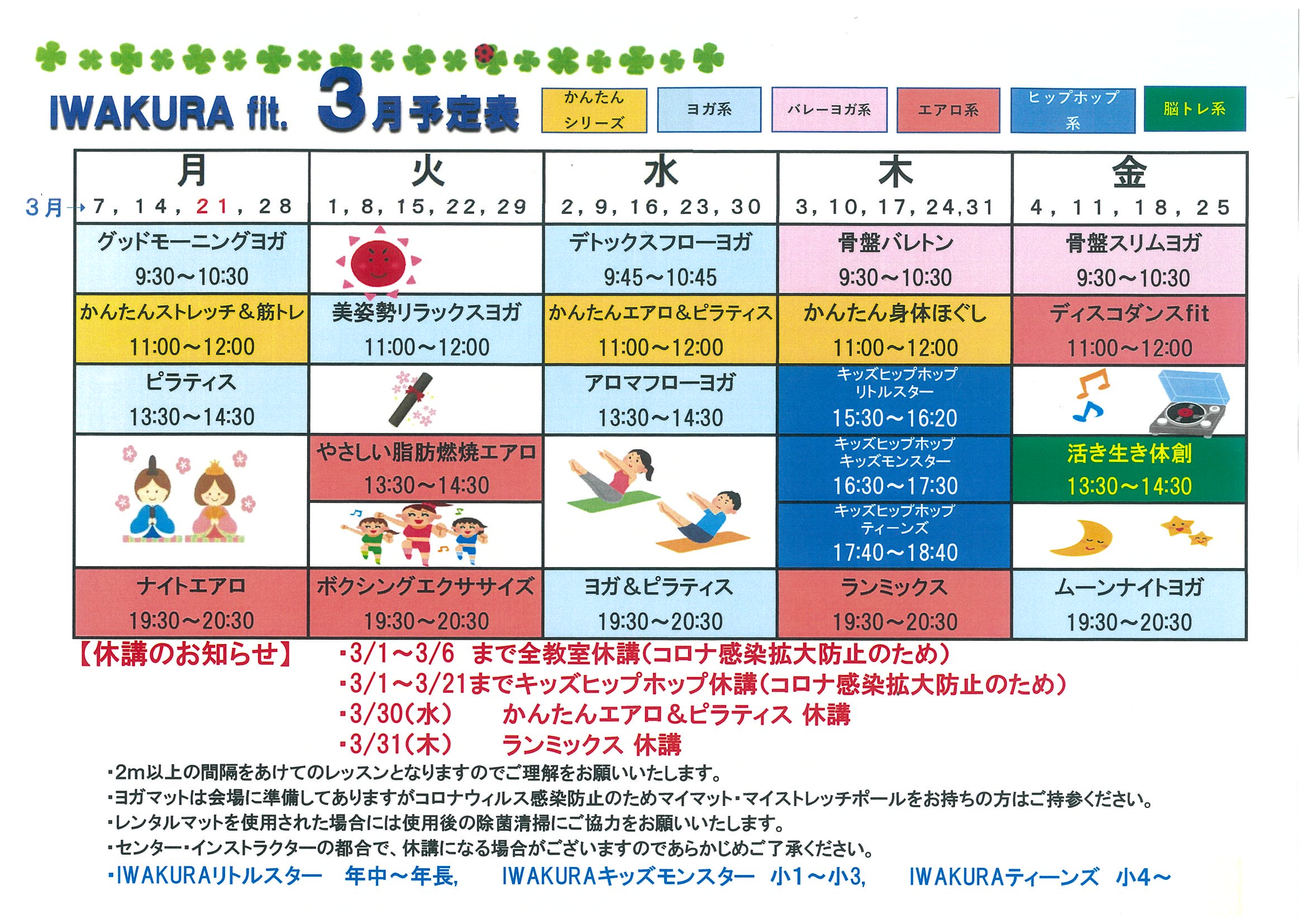 3月 IWAKURAFitスケジュール(変更)3/1〜3/21まで キッズヒップホップ休講