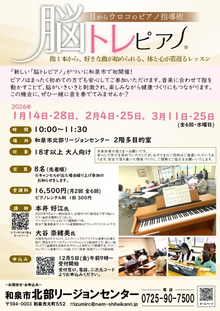 「脳トレピアノ」がついに和泉市で初開催!ピアノはまったく初めての方でも安心してご参加いただけます。音楽に合わせて指を動かすことで、脳がいきいきと刺激され、楽しみながら健康づくりにもつながります。この機会に、ぜひ一緒に音を奏でてみませんか?