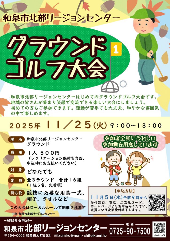 和泉市北部リージョンセンターはじめてのグラウンドゴルフ大会です。地域の皆さんが集まり笑顔で交流できる楽しい大会にしましょう。