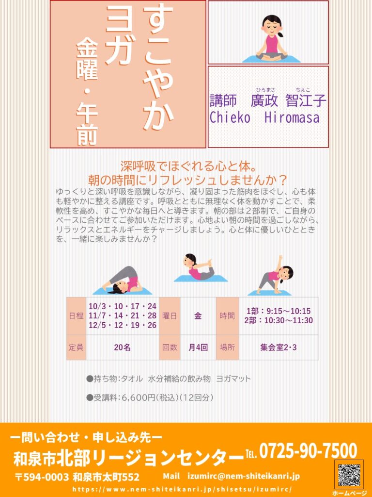 ゆっくりと深い呼吸を意識しながら、凝り固まった筋肉をほぐし、心も体も軽やかに整える講座です。呼吸とともに無理なく体を動かすことで、柔軟性を高め、すこやかな毎日へと導きます。朝の部は2部制で、ご自身のペースに合わせてご参加いただけます。心地よい朝の時間を過ごしながら、リラックスとエネルギーをチャージしましょう。心と体に優しいひとときを、一緒に楽しみませんか?