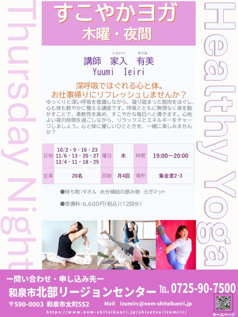ゆっくりと深い呼吸を意識しながら、凝り固まった筋肉をほぐし、心も体も軽やかに整える講座です。呼吸とともに無理なく体を動かすことで、柔軟性を高め、すこやかな毎日へと導きます。心地よい夜の時間を過ごしながら、リラックスとエネルギーをチャージしましょう。心と体に優しいひとときを、一緒に楽しみませんか?