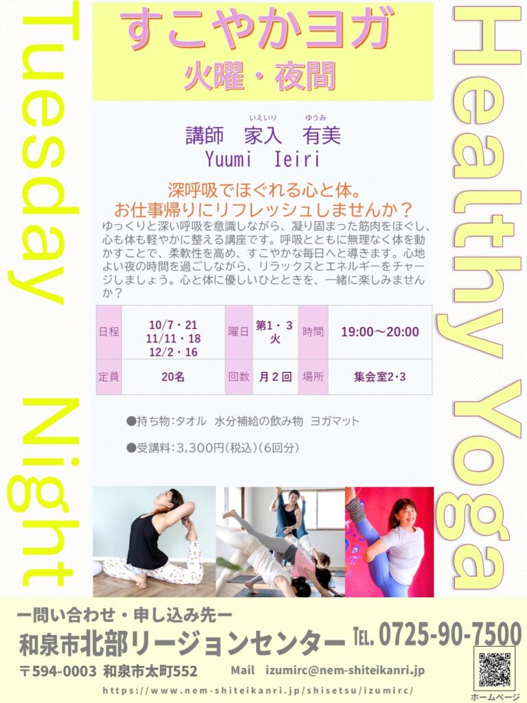 ゆっくりと深い呼吸を意識しながら、凝り固まった筋肉をほぐし、心も体も軽やかに整える講座です。呼吸とともに無理なく体を動かすことで、柔軟性を高め、すこやかな毎日へと導きます。心地よい夜の時間を過ごしながら、リラックスとエネルギーをチャージしましょう。心と体に優しいひとときを、一緒に楽しみませんか?