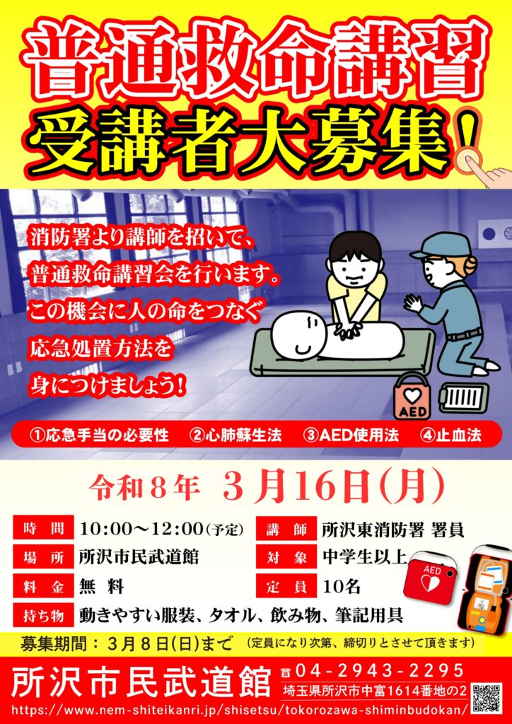 【受講者募集】普通救命講習Ⅰ 2026年2月26日 最終更新日時 : 2026年2月26日 tokoro 『普通救命講習Ⅰ』の参加者を募集いたします。消防署より講師を招いて普通救命講習を実施します。この機会にあなたの大切な人の命をつなぐ応急処置方法を身につけましょう!