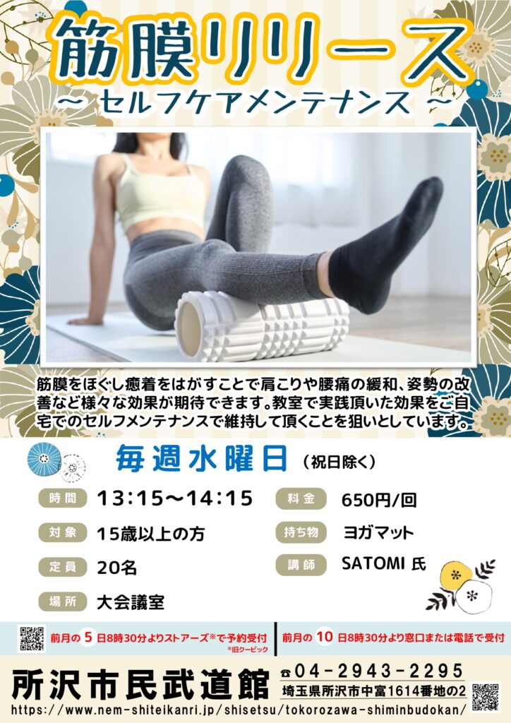 11月から筋膜リリースの教室を開講します。11/5,12,19,26日の13:15~14:15