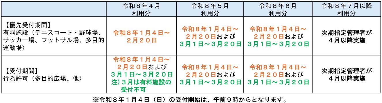 令和8年度は指定管理者の変更に伴い、優先予約及び行為許可の受付スケジュールが例年とは異なります。(以下参照)